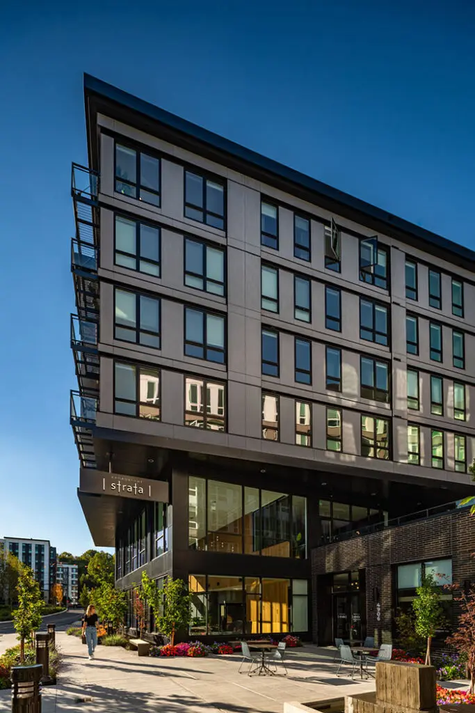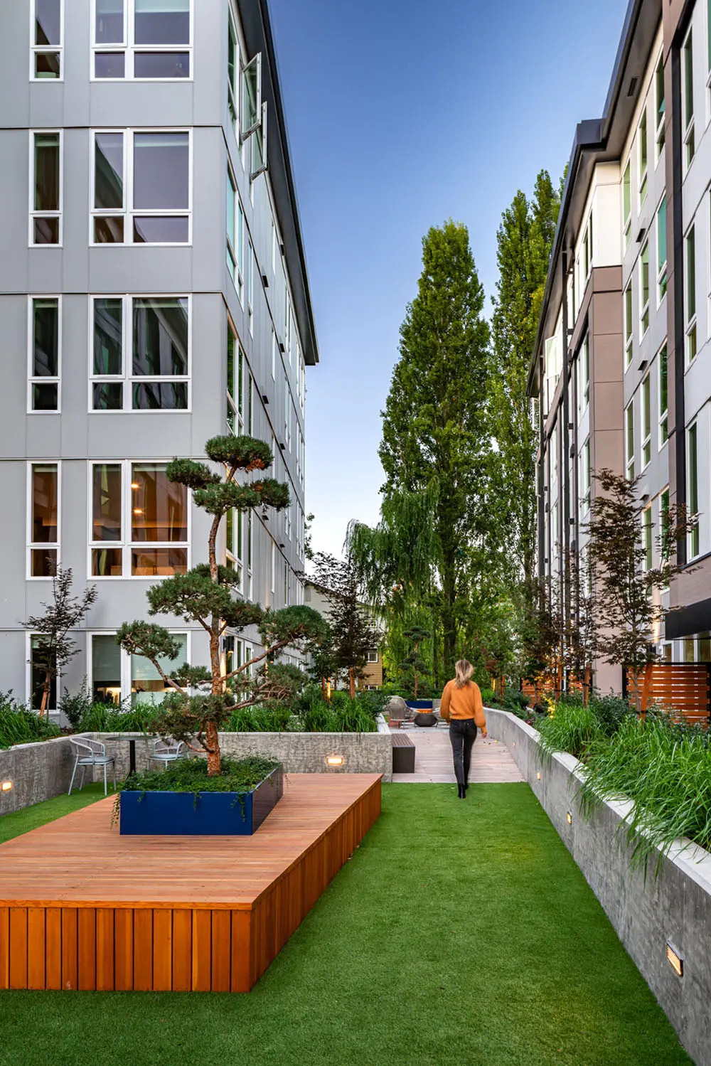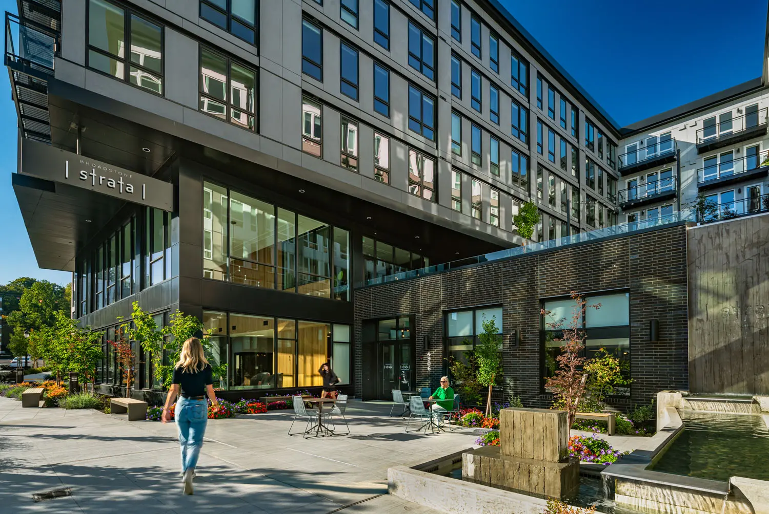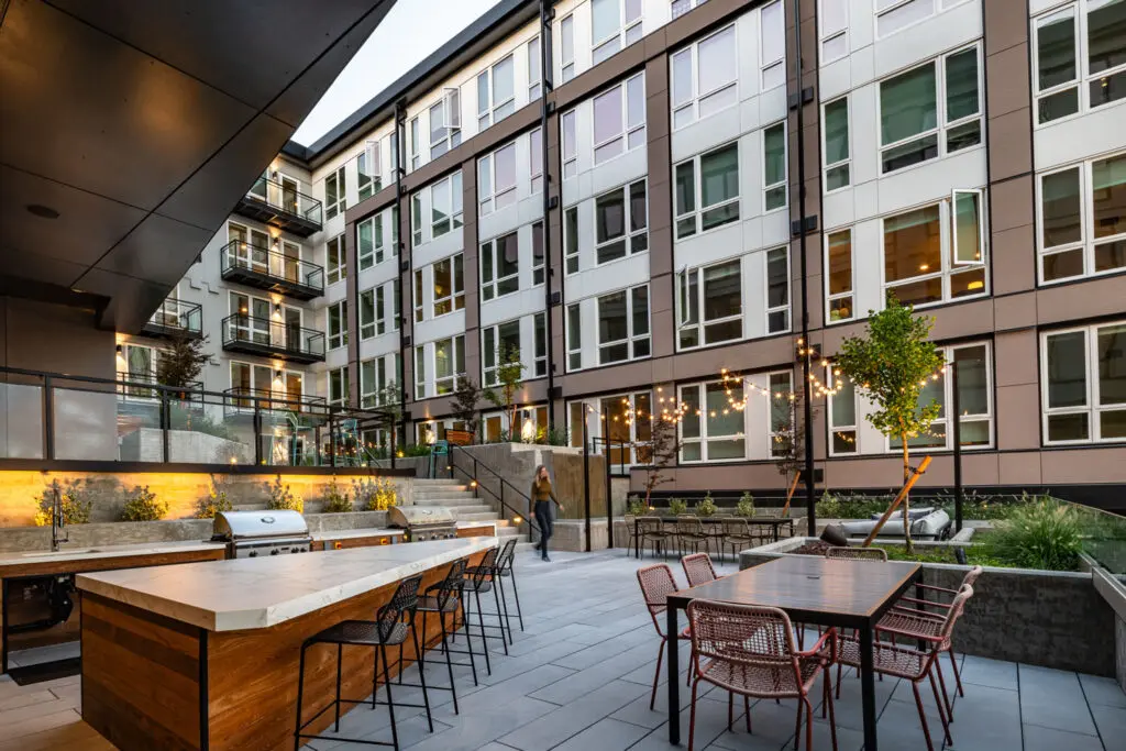 The four wings of the building surround a series of three south-facing courtyards, providing sunlight, visual interest, and an enclave of outdoor gathering spaces tucked away from 49th Street. Opportunities for small group socialization abound—from the communal fire pit and barbecues to private patios—linked by an inter-courtyard walking path.