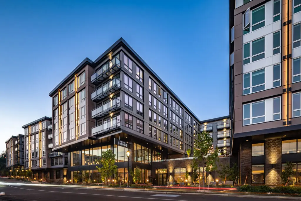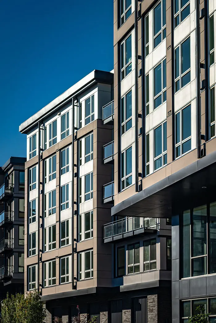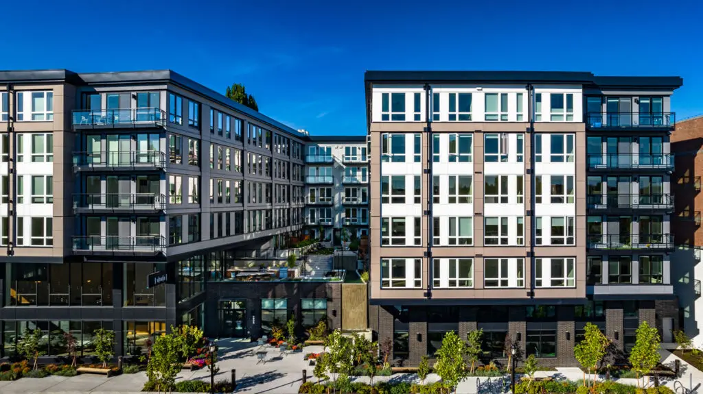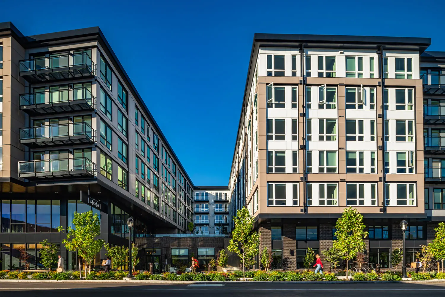 The four wings of the building surround a series of three south-facing courtyards, providing sunlight, visual interest, and an enclave of outdoor gathering spaces tucked away from 49th Street. Opportunities for small group socialization abound—from the communal fire pit and barbecues to private patios—linked by an inter-courtyard walking path.