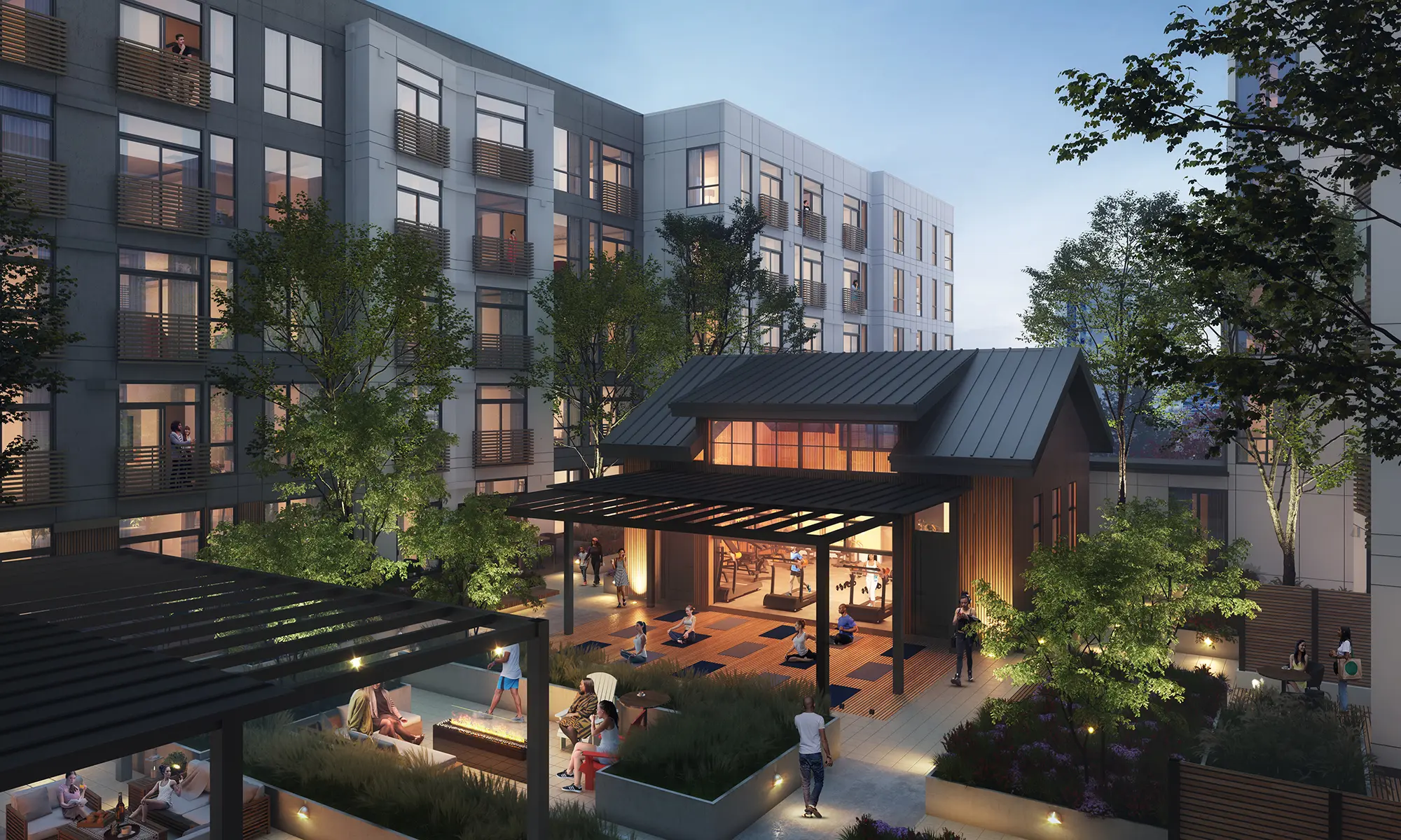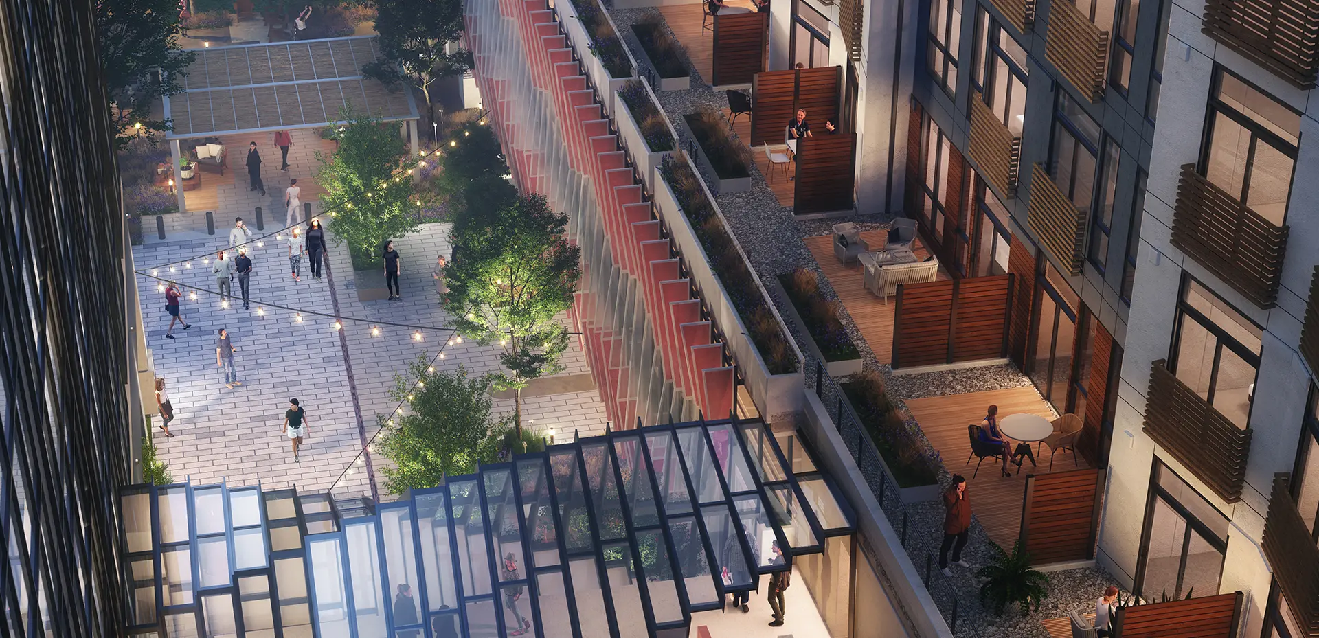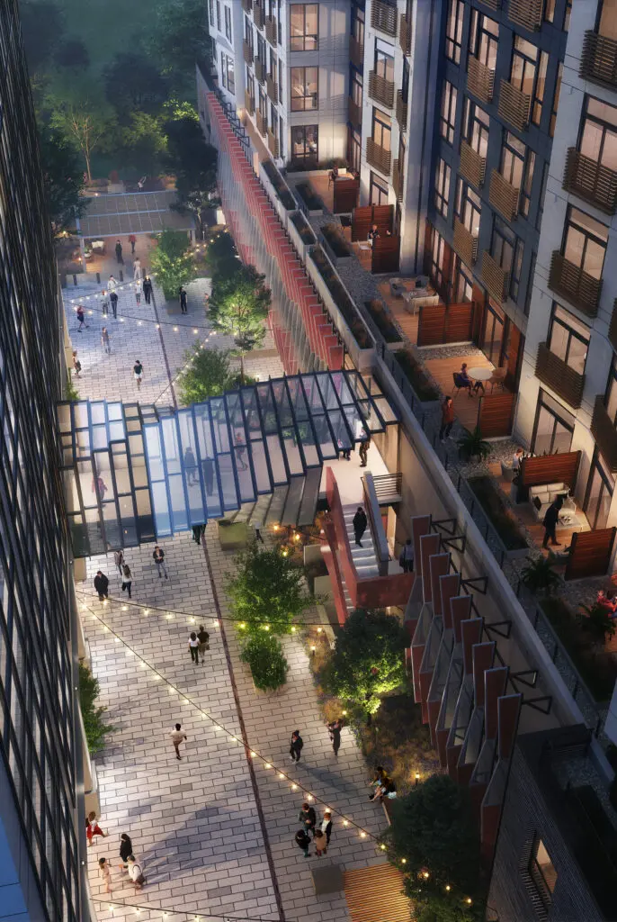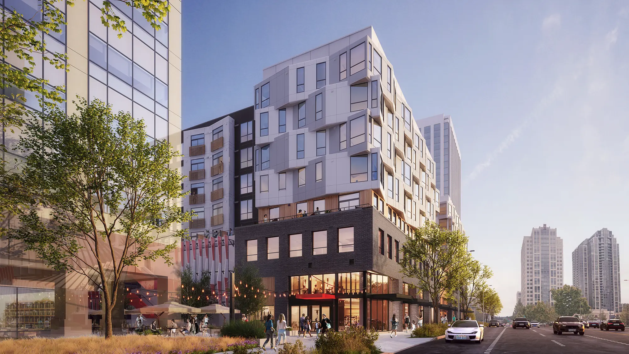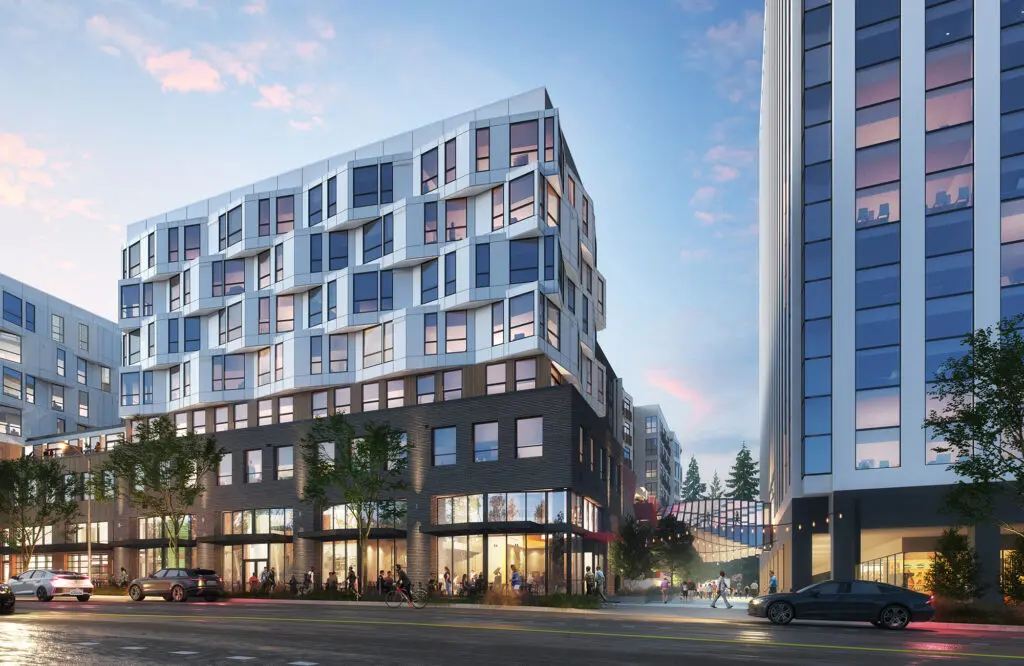 Located in the heart of Downtown Bellevue near the new light-rail station, the 1970’s era three building office park has been underutilized and new development hindered by the existing open parking garage. Rather than demolishing the existing garage, a new structural system will be inserted through the existing structure to provide a podium for a new residential complex with two towers surrounding a shared courtyard. The new addition extends to the ground in front of the existing garage to provide a new vibrant streetscape that completely shields the existing garage from view.
