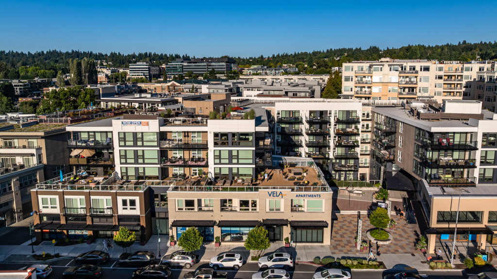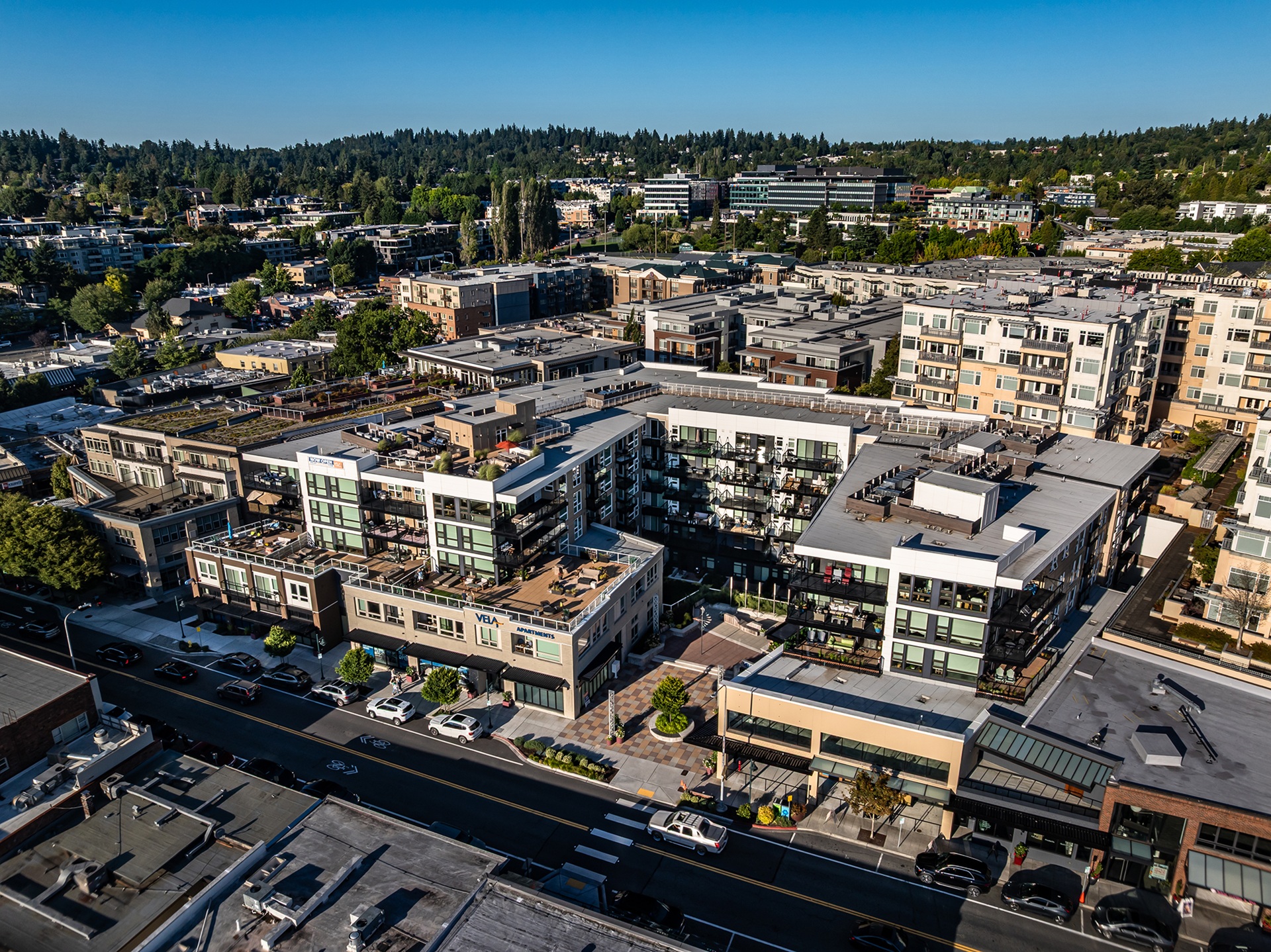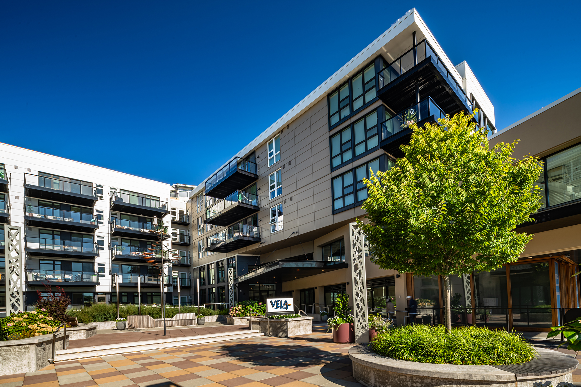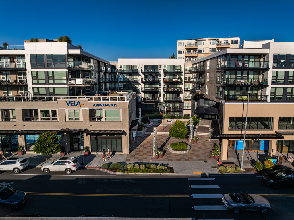 Vela Apartments builds upon the 1980s Kirkland Waterfront Market, wrapping up and over the intact original structure to offer new housing units above. New materials and massing connect to the existing, especially around the retail frontage—reflecting the surrounding charm of Kirkland, while adding new spirit to the streetscape. With its angled facades, the building generates privacy for residents while maximizing the number of units that will have excellent views of the water and large-scale balconies.