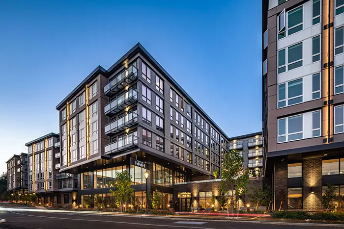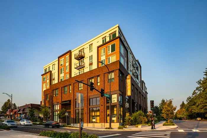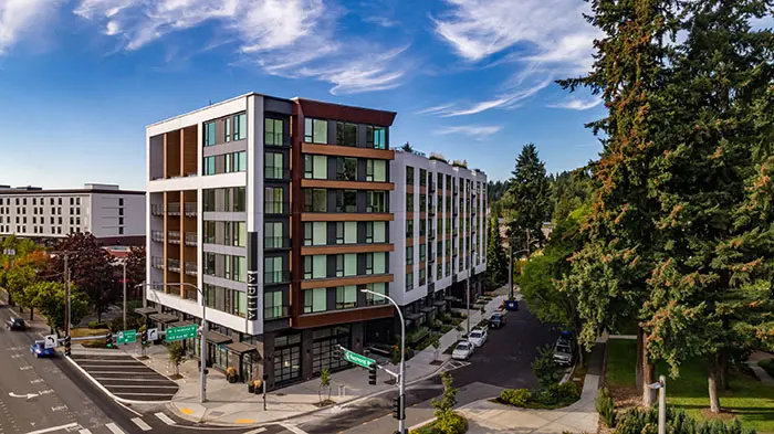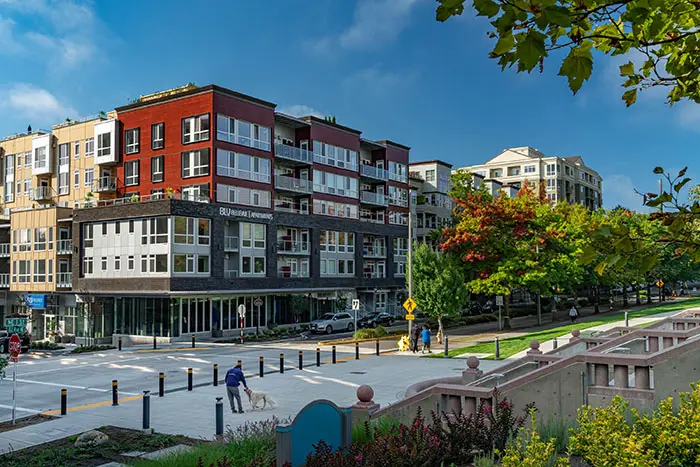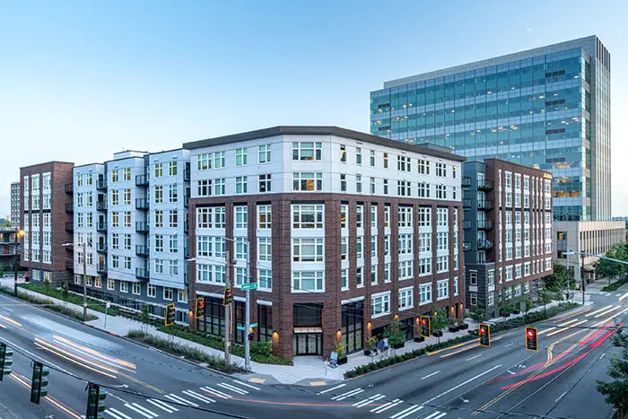 Expanding the livable extent of the Bellevue core. One of the first projects to enact the new Bellevue zoning code, Surrey on Main occupies an important corner of the downtown boundary. The project provides a graceful transition from the higher density of the city to the less-concentrated living quarters of the surrounding neighborhood.