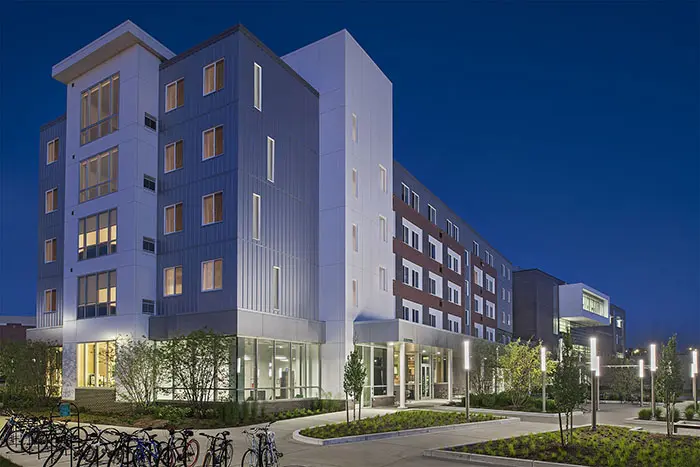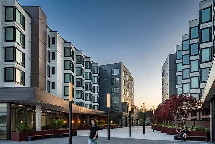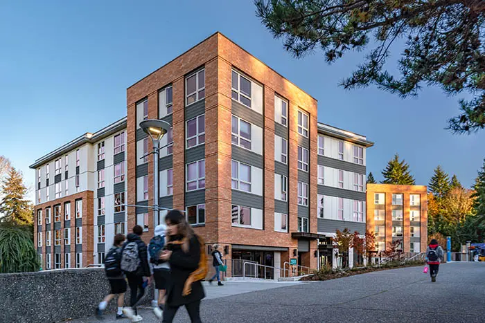 Creating the college’s first-ever student housing. Our task was to build the first student housing ever at Shoreline Community College. This would also be the first new building on the campus in over 20 years. The idea was to create a modern gateway to the school that captured the mid-century aesthetic predominant on the campus.