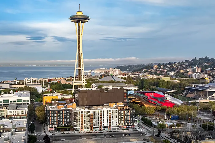 An Uptown building with World’s Fair flair. Siteline, a development blending residential, office, and retail under one roof, sits at the confluence of Lower Queen Anne, Denny Triangle, and South Lake Union. This mixed-use Uptown community draws inspiration from neighboring Seattle Center—the civic hub originally developed for the 1962 World’s Fair—by weaving in history, context, and arts into the design.