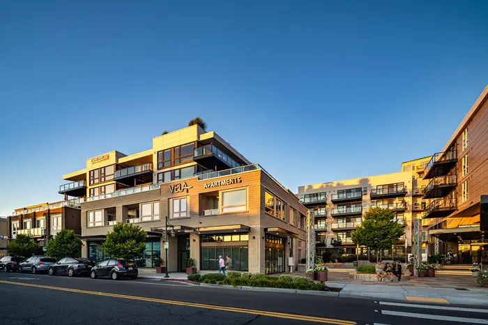 Evolving up and over. Vela Apartments builds upon the 1980s Kirkland Waterfront Market, wrapping up and over the intact original structure to offer new housing units above. New materials and massing connect to the existing, especially around the retail frontage—reflecting the surrounding charm of Kirkland, while adding new spirit to the streetscape. With its angled facades, the building generates privacy for residents while maximizing the number of units that will have excellent views of the water and large-scale balconies.